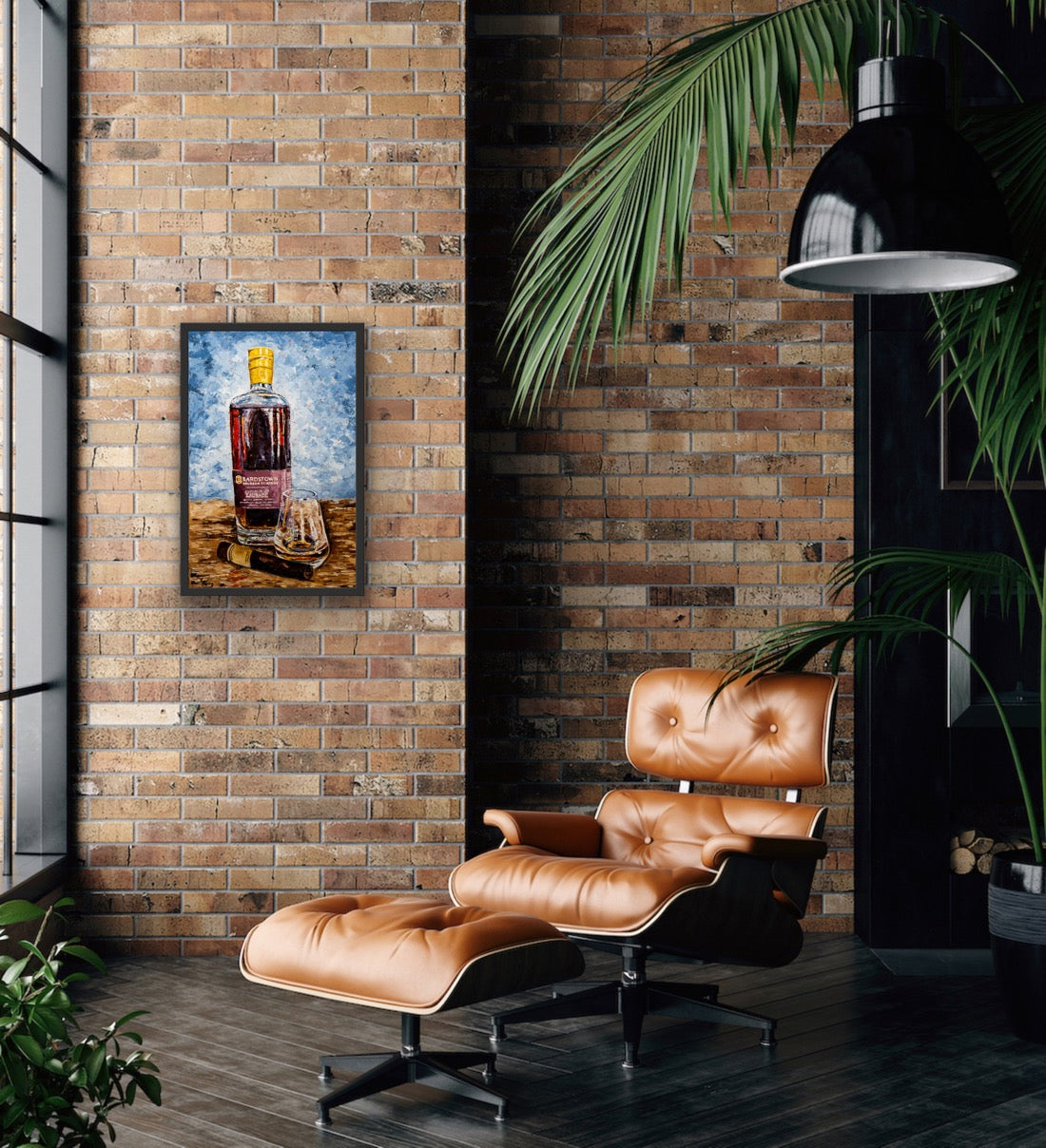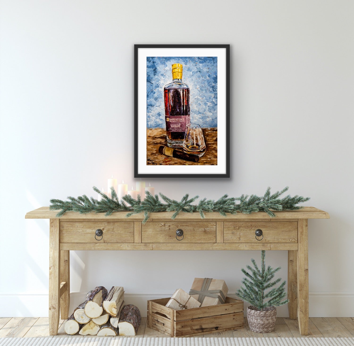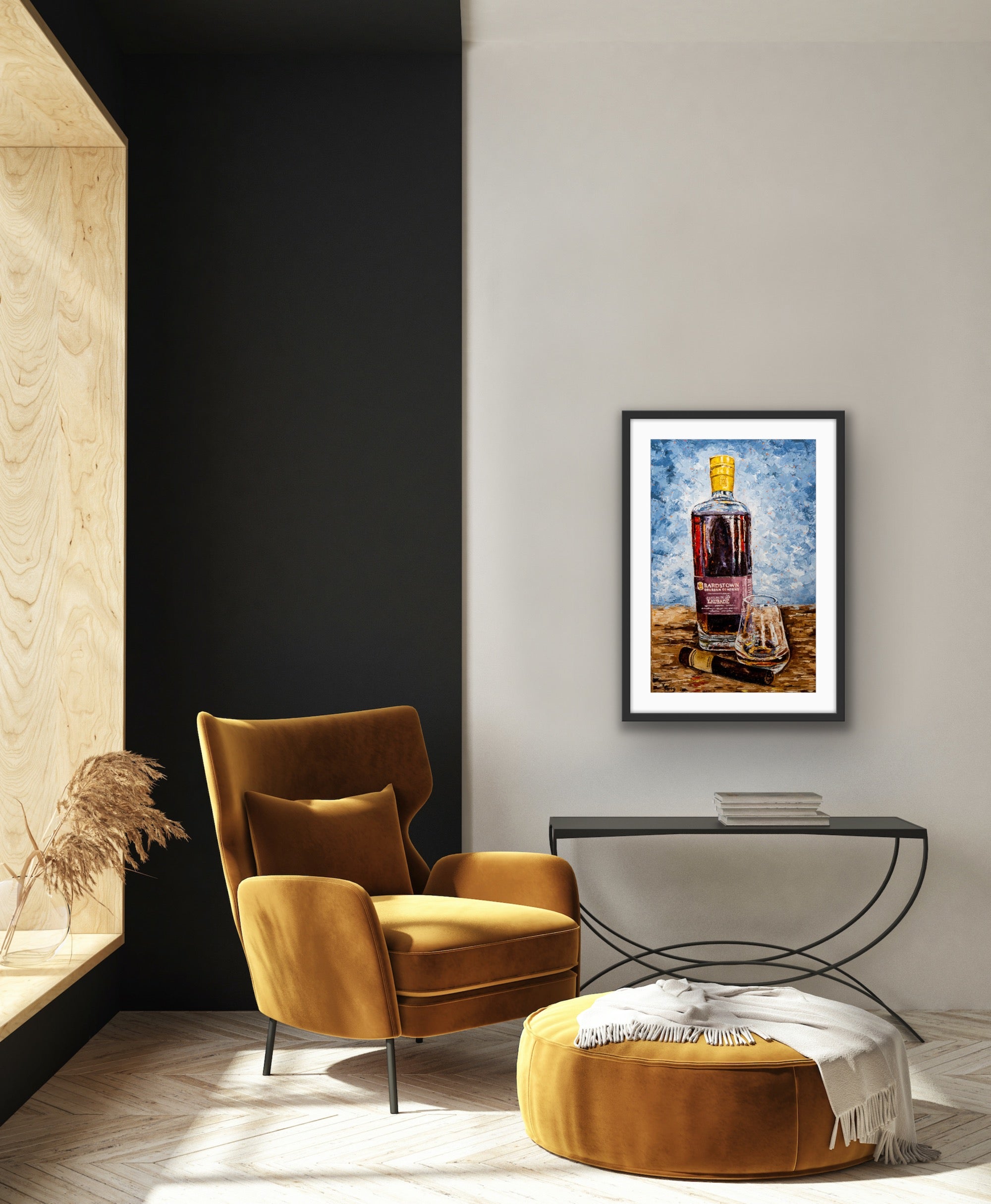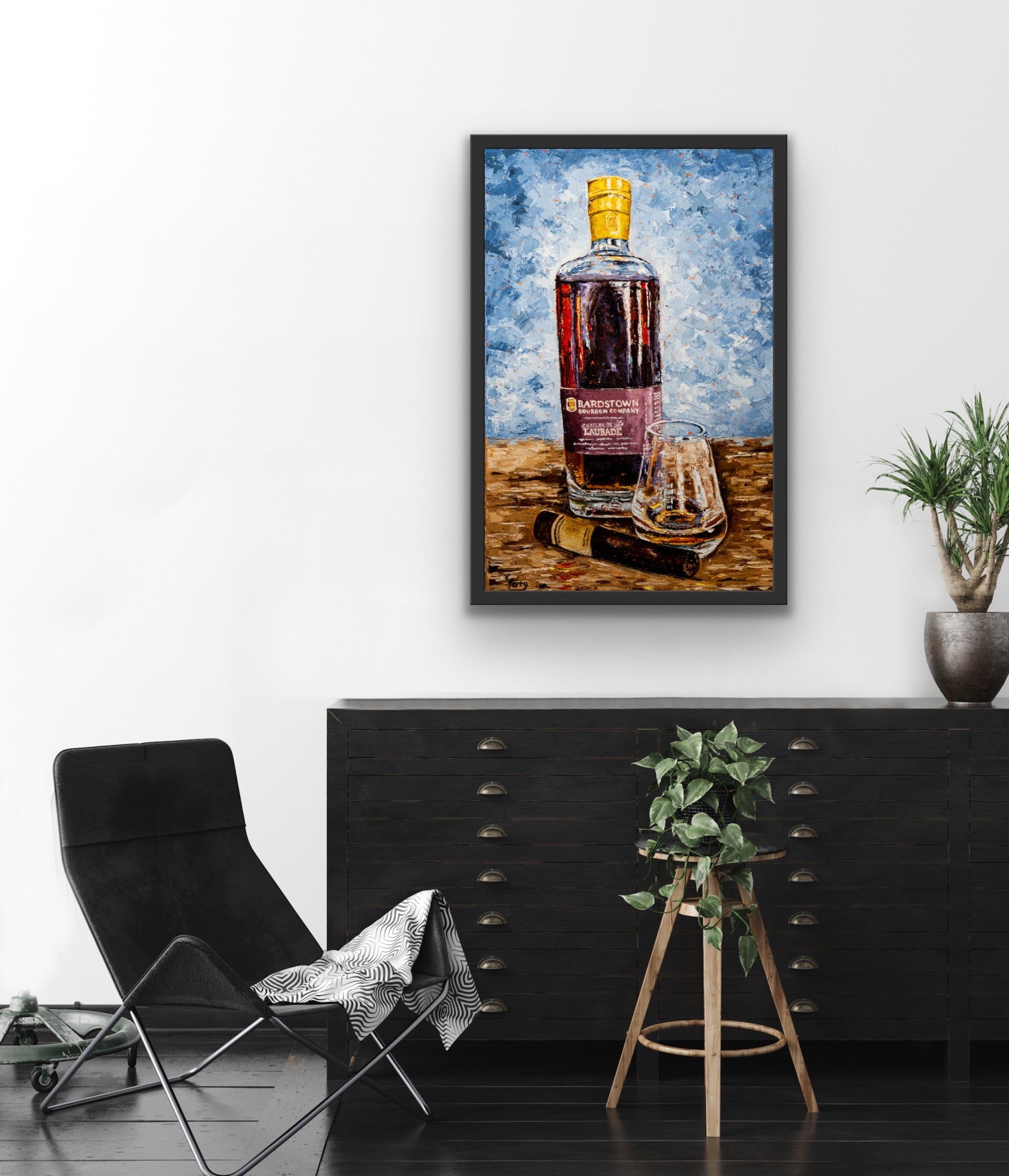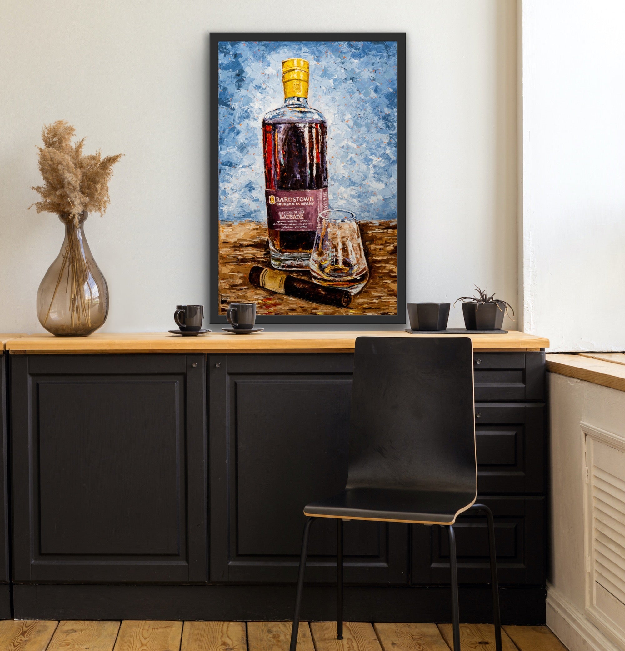 Created and inspired from the recent "Better with Bourbon" collection. 95% of the world's bourbon is produced right in the heart of Kentucky. Kim captures the artistry, the craftsmanship, and the legacy of each bottle by the unique palette knife technique using bold, intense colors.