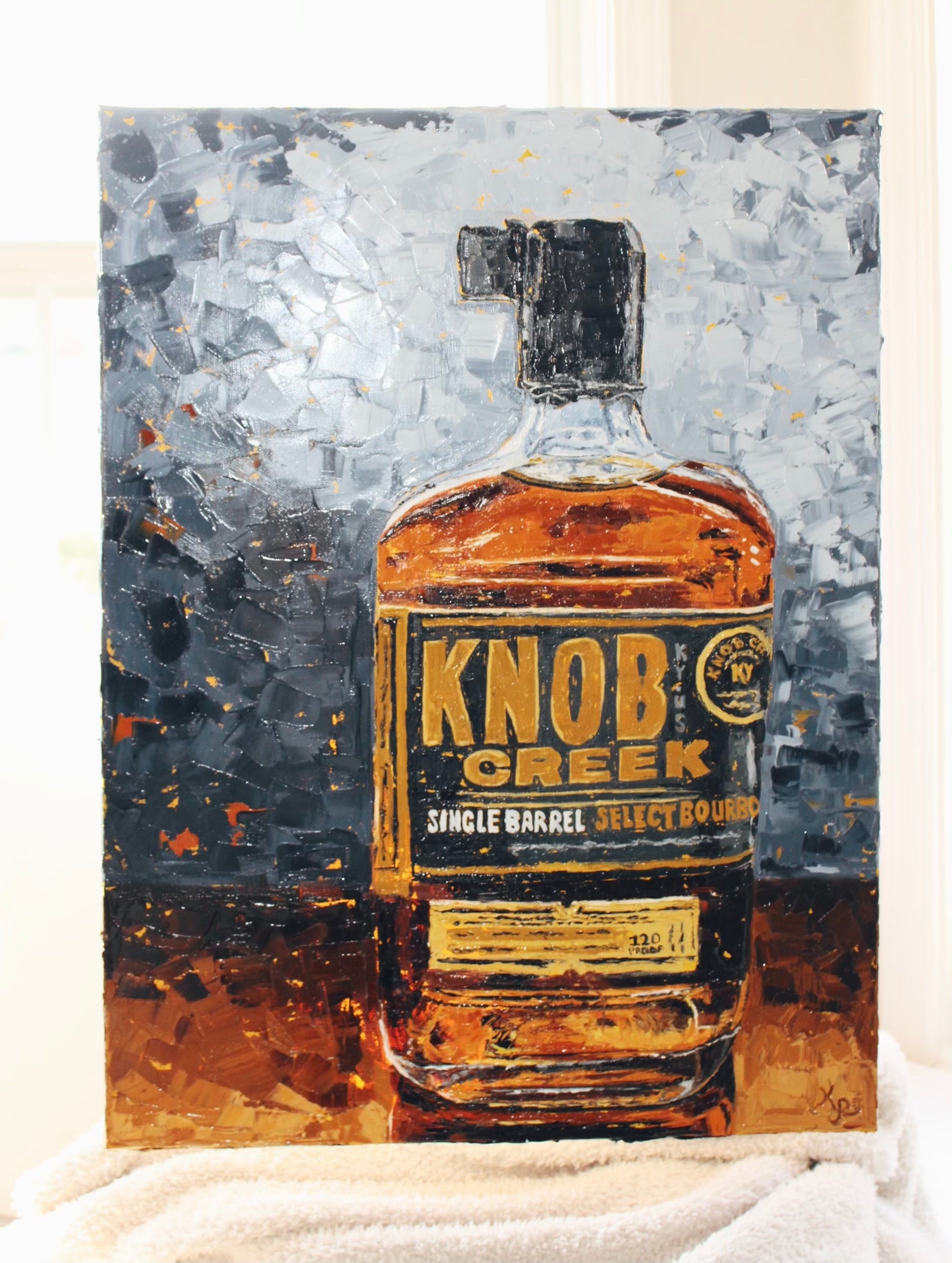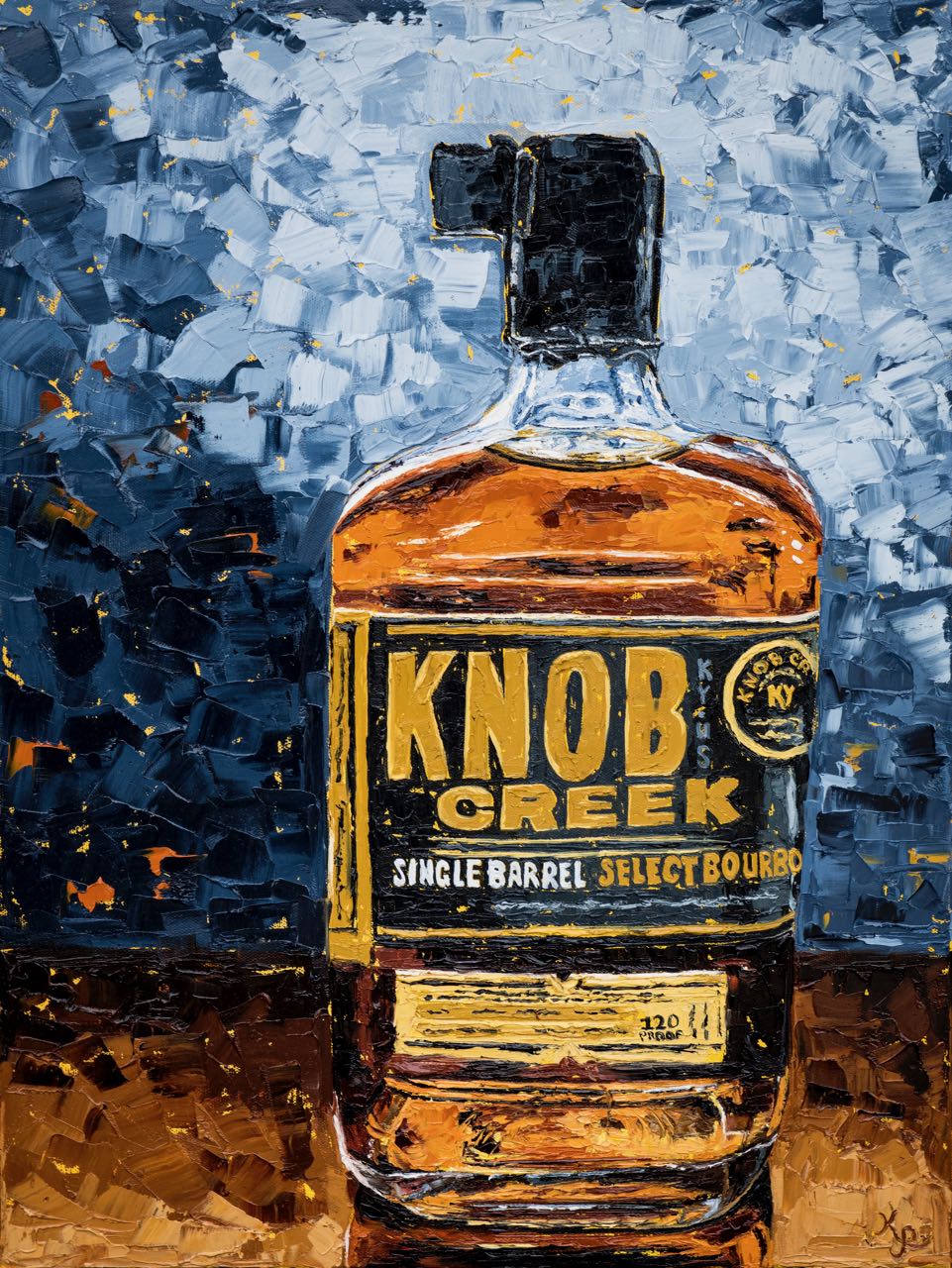 Created and inspired from the recent "Better with Bourbon" collection.  95% of the world's bourbon is produced right in the heart of Kentucky.  Kim captures the artistry, the craftsmanship, and the legacy of each bottle by the unique palette knife technique using bold, intense colors.