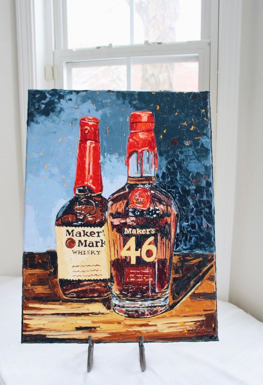 Created and inspired from the recent "Better with Bourbon" collection. 95% of the world's bourbon is produced right in the heart of Kentucky. Kim captures the artistry, the craftsmanship, and the legacy of each bottle by the unique palette knife technique using bold, intense colors.