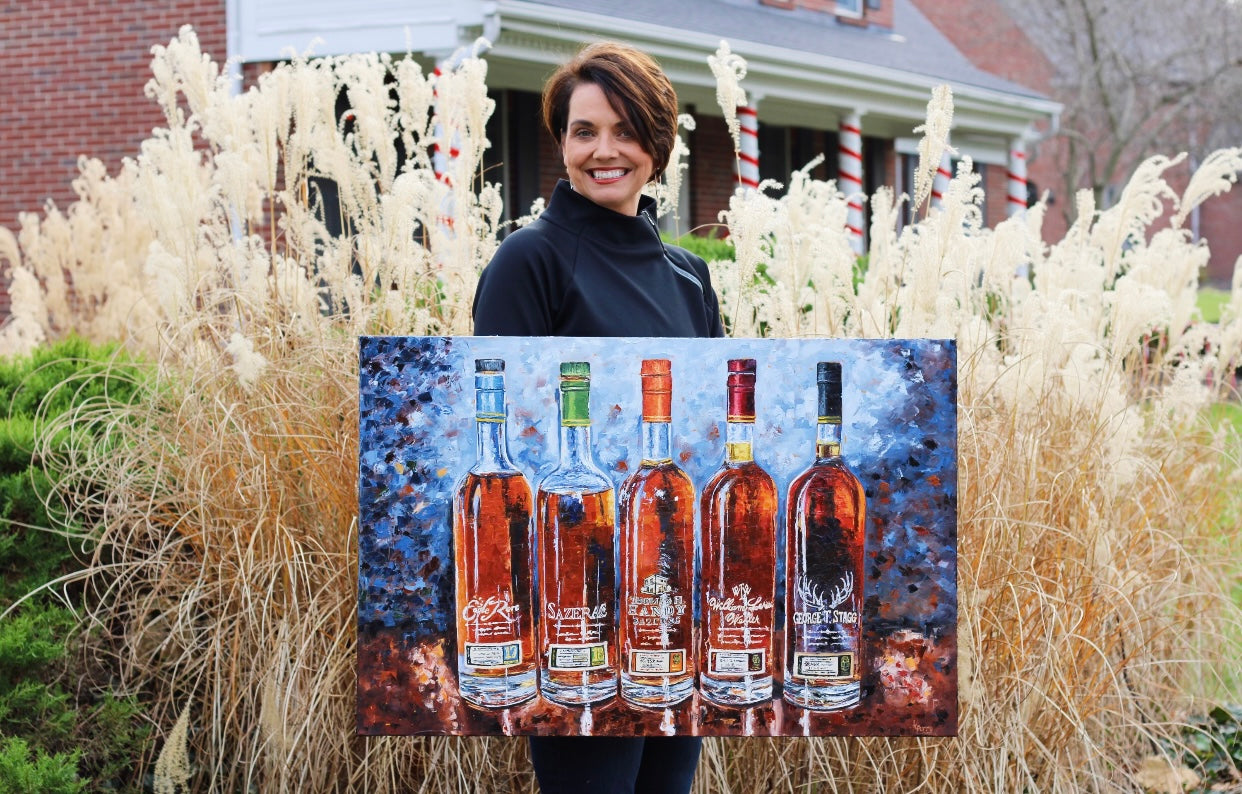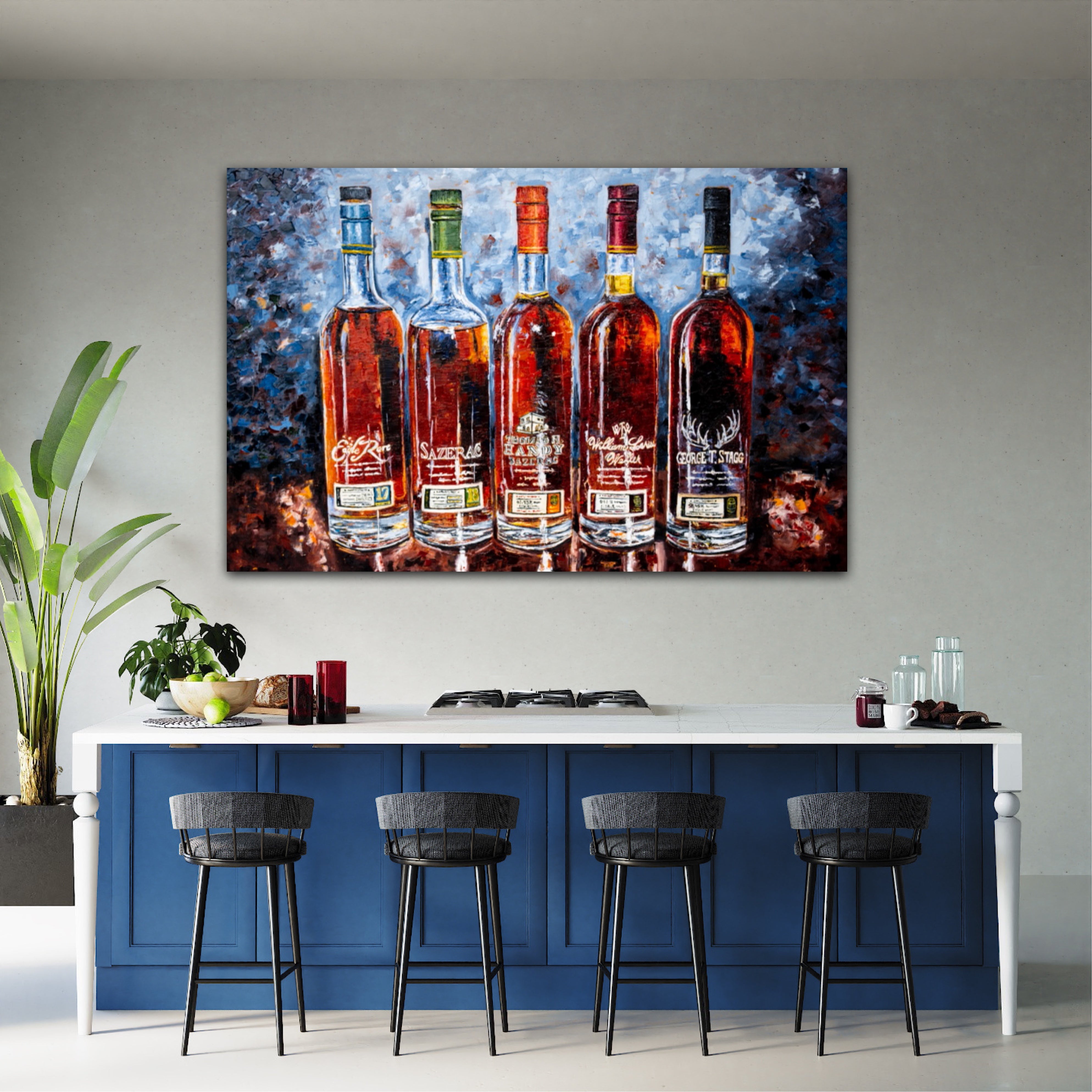 Created and inspired from the recent "Better with Bourbon" collection. 95% of the world's bourbon is produced right in the heart of Kentucky. Kim captures the artistry, the craftsmanship, and the legacy of each bottle by the unique palette knife technique using bold, intense colors.