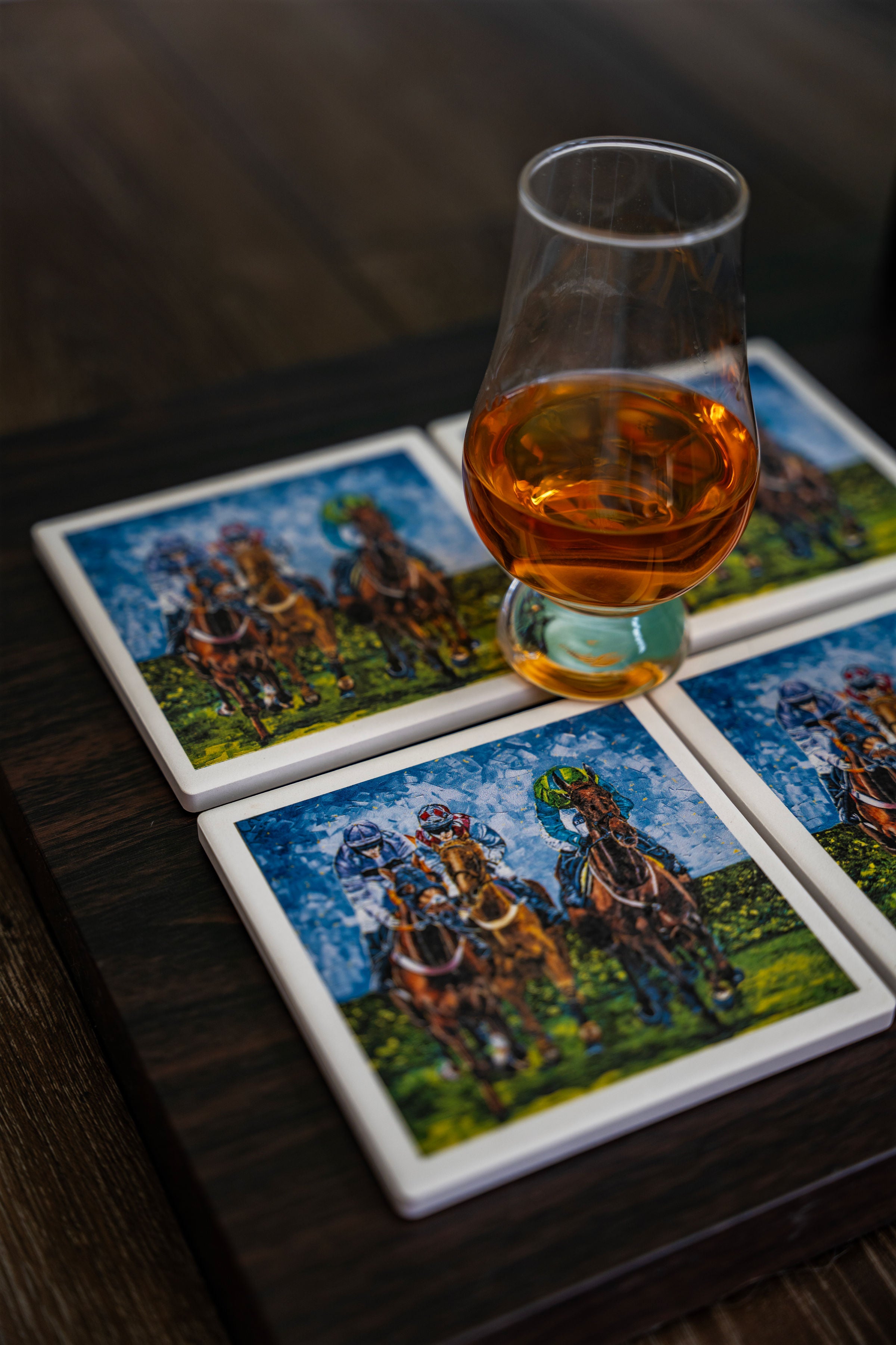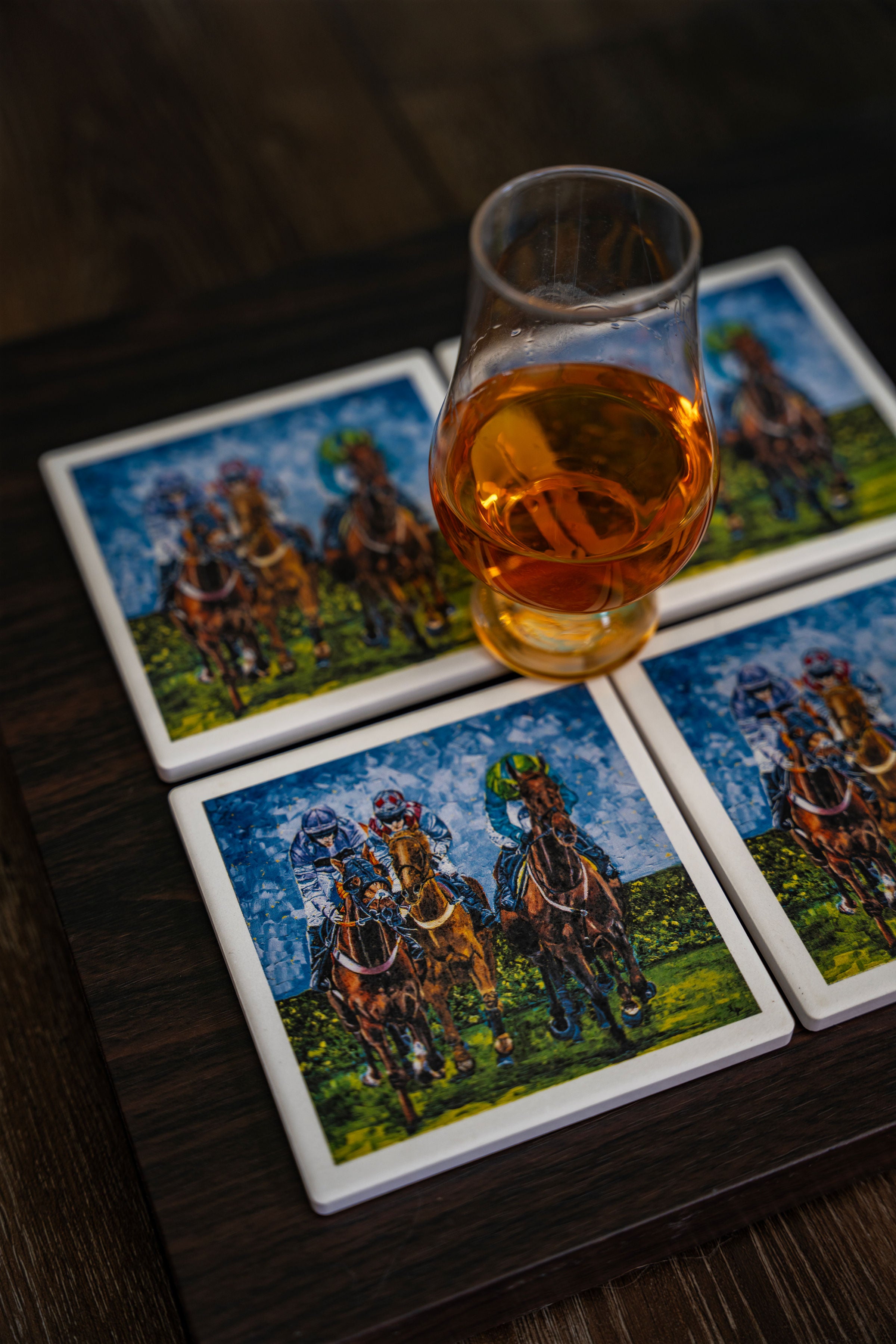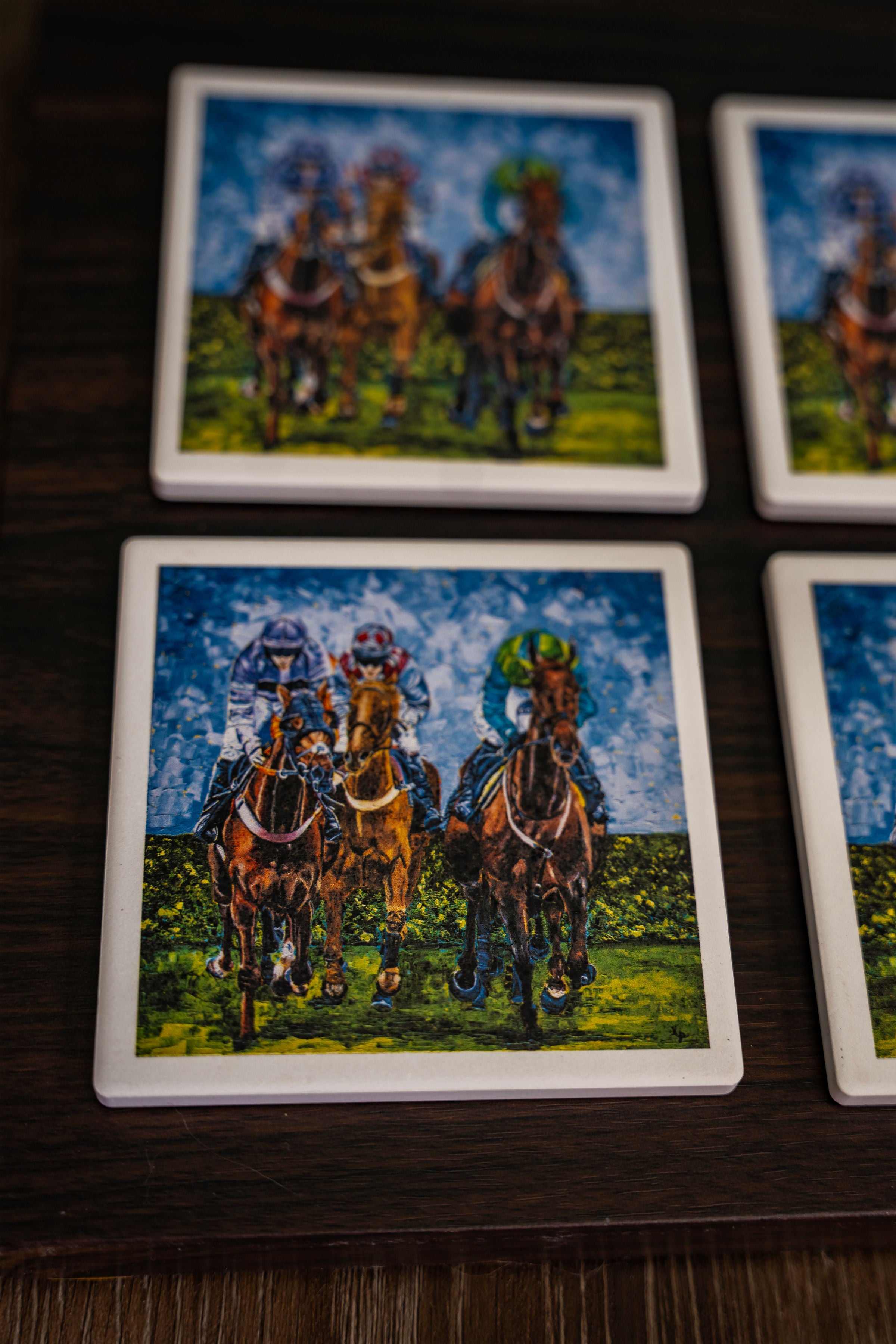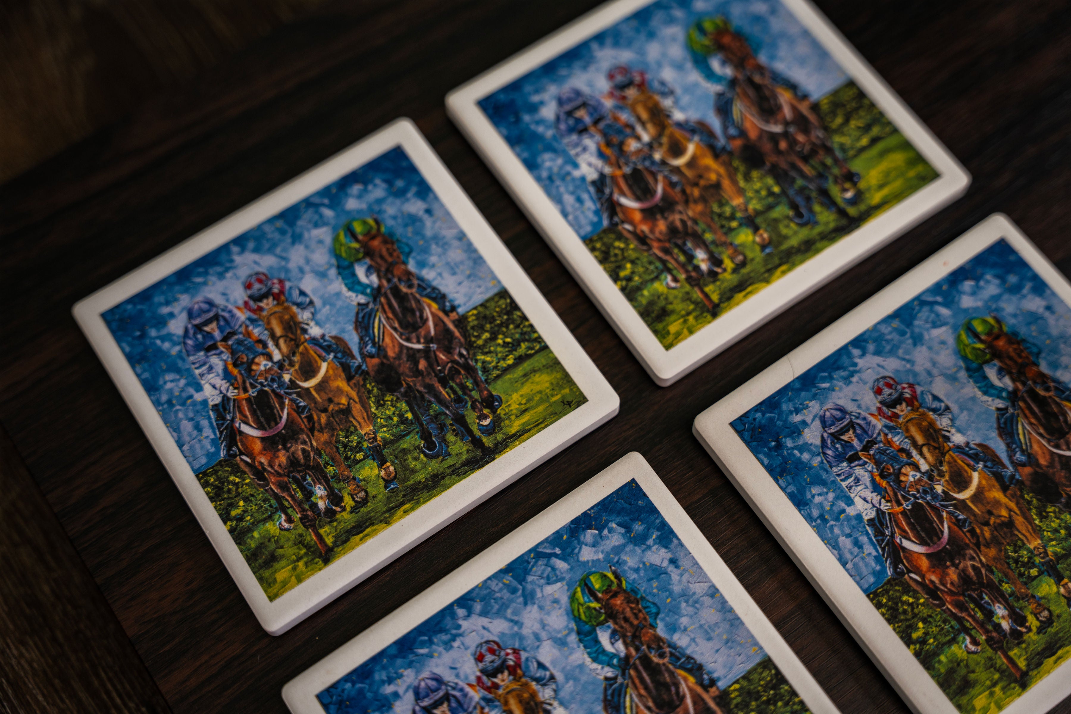 Welcome to my collection of stone coasters featuring the stunning original "Win, Place, and Show!" These coasters are the perfect addition to any equestrian enthusiast's home or any that have a love of the culture of the horse racing industry. Each coaster showcases a unique and captivating painting inspired by the thrilling world of horse racing.