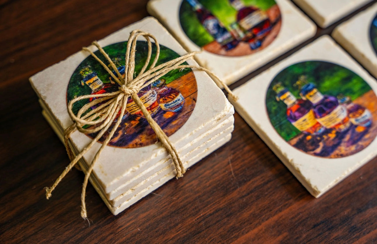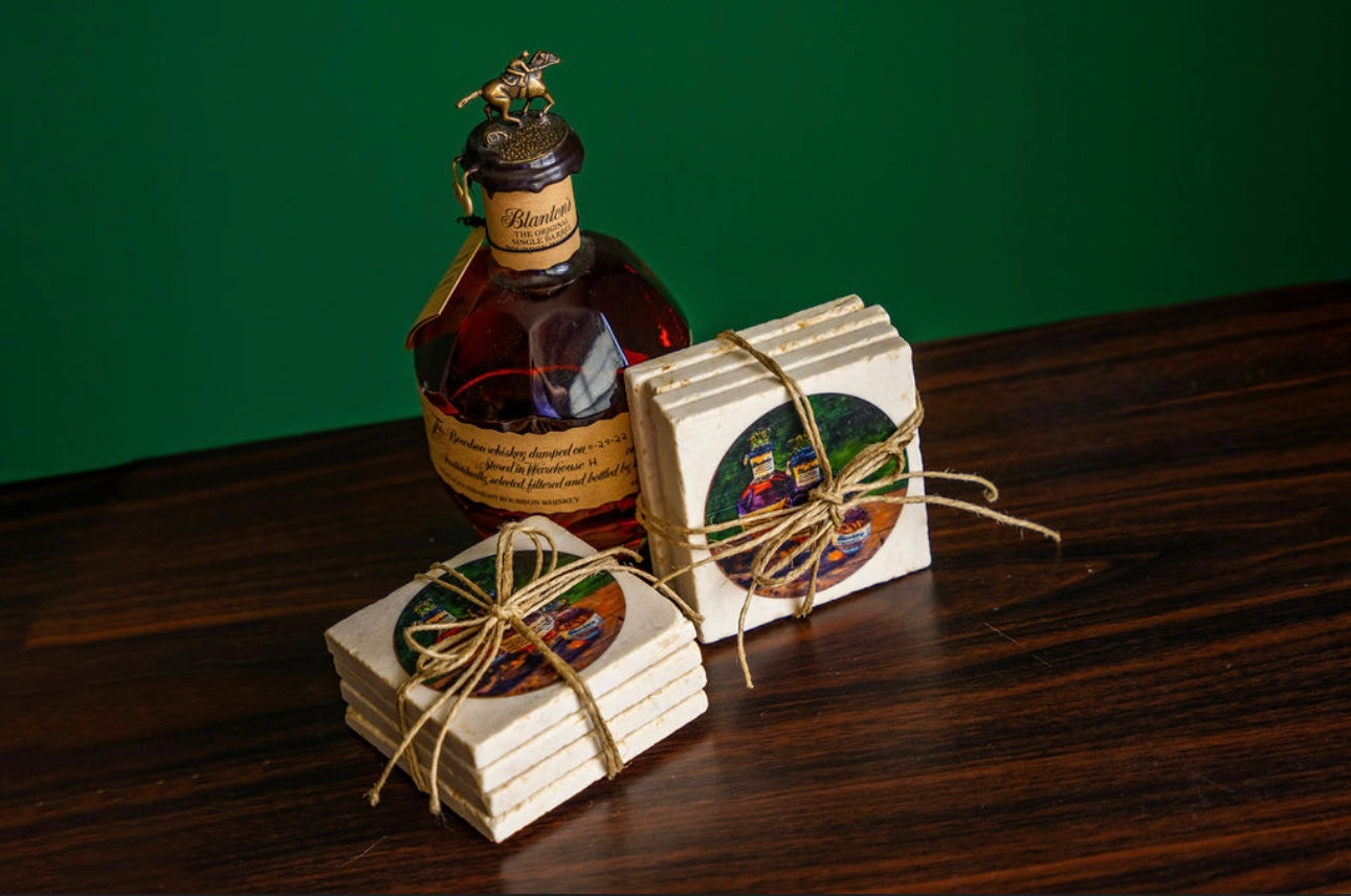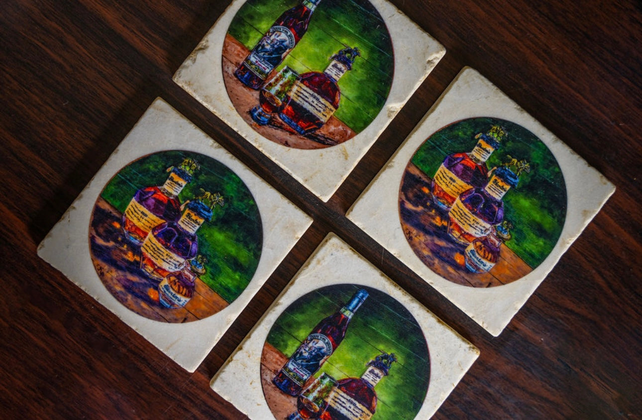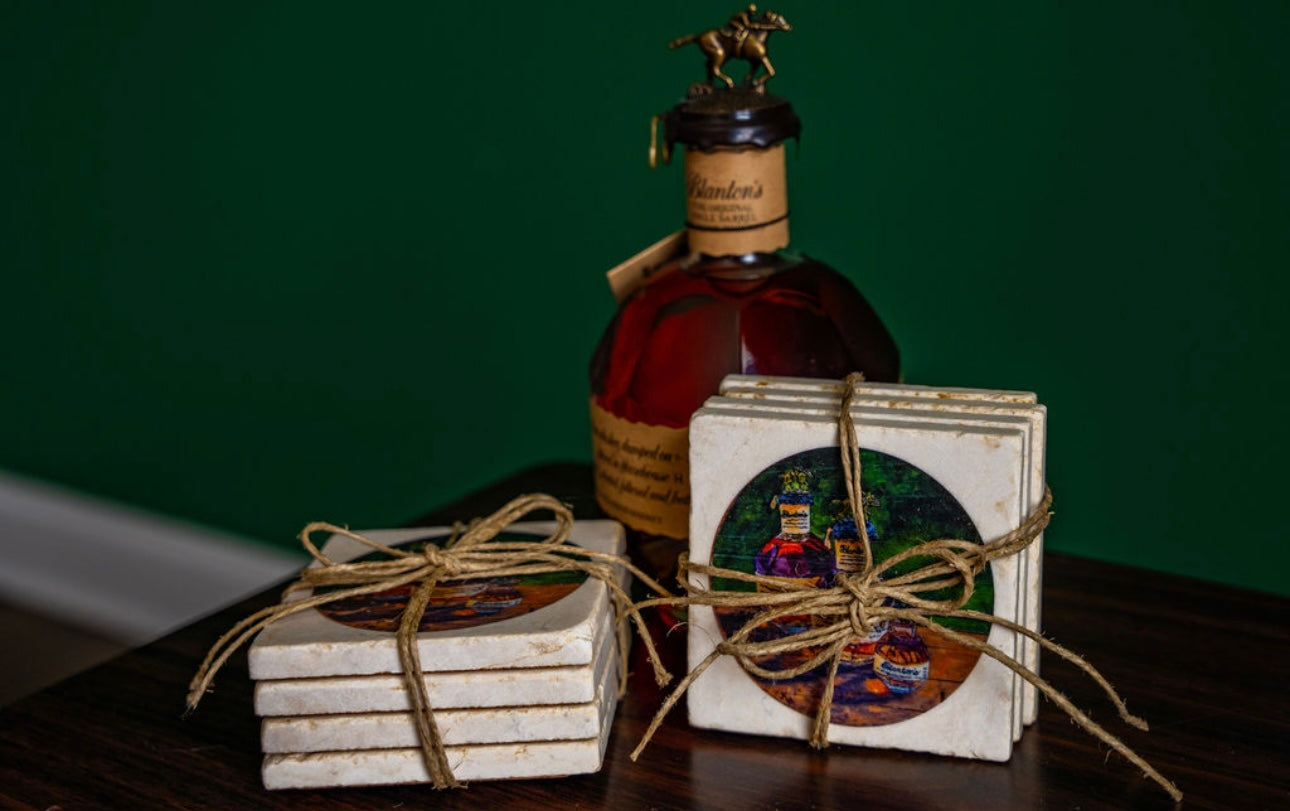 Handcrafted coasters from authentic tumbled marble, Kim Perry's design from her original paintings of Blantons and Pappy Van Winkle bring timeless artistry and function to the table. Each coaster is made in the USA using natural stone, giving it a unique character with subtle variations in texture and color. Designs are hand-printed to create rich, lasting images that won’t fade or peel, while the natural absorbency of the marble helps protect surfaces from condensation. Backed with cork to prevent scratches, these coasters combine durability, elegance, and everyday practicality—perfect for gifting or for adding a touch of classic style to any home or that special bourbon bar.