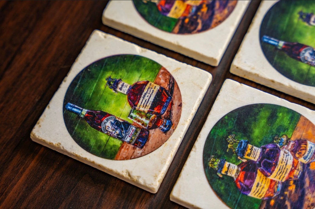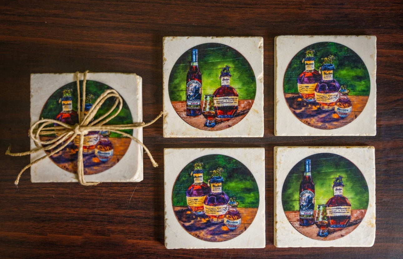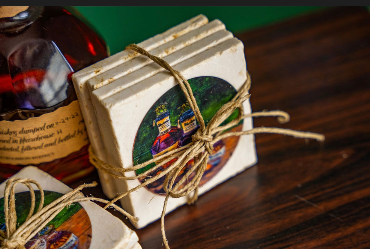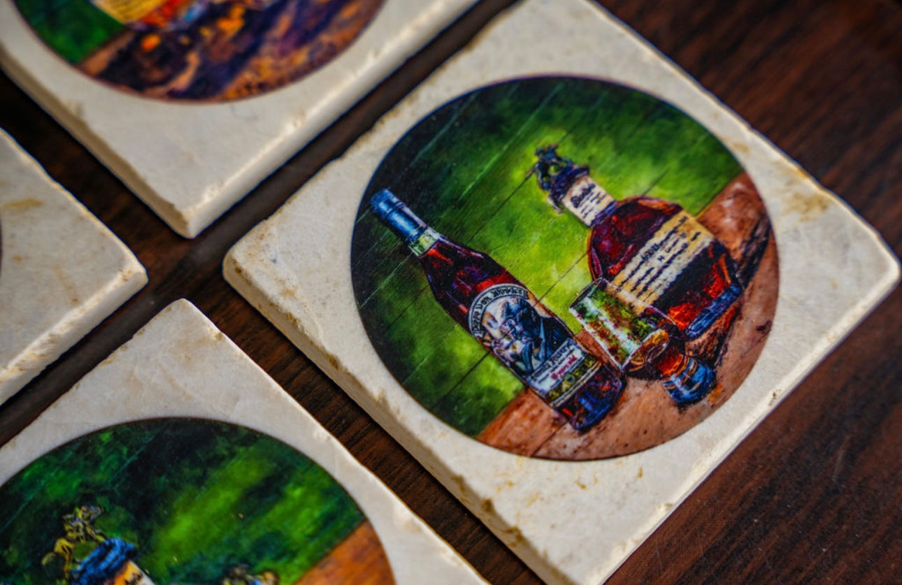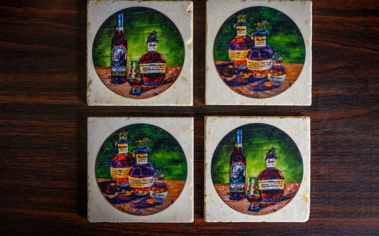 Handcrafted coasters from authentic tumbled marble, Kim Perry's design from her original paintings of Blantons and Pappy Van Winkle bring timeless artistry and function to the table. Each coaster is made in the USA using natural stone, giving it a unique character with subtle variations in texture and color. Designs are hand-printed to create rich, lasting images that won’t fade or peel, while the natural absorbency of the marble helps protect surfaces from condensation. Backed with cork to prevent scratches, these coasters combine durability, elegance, and everyday practicality—perfect for gifting or for adding a touch of classic style to any home or that special bourbon bar.