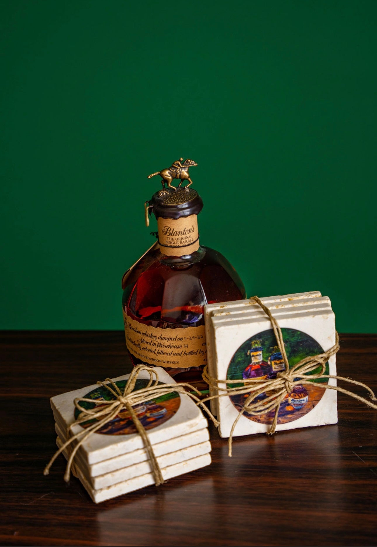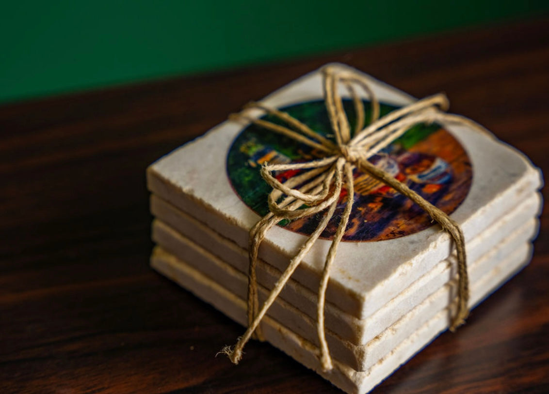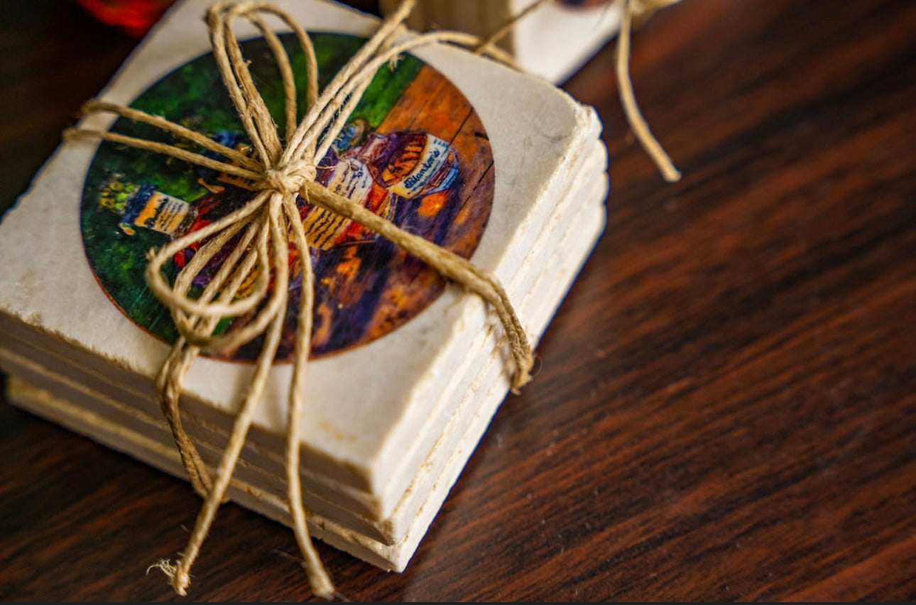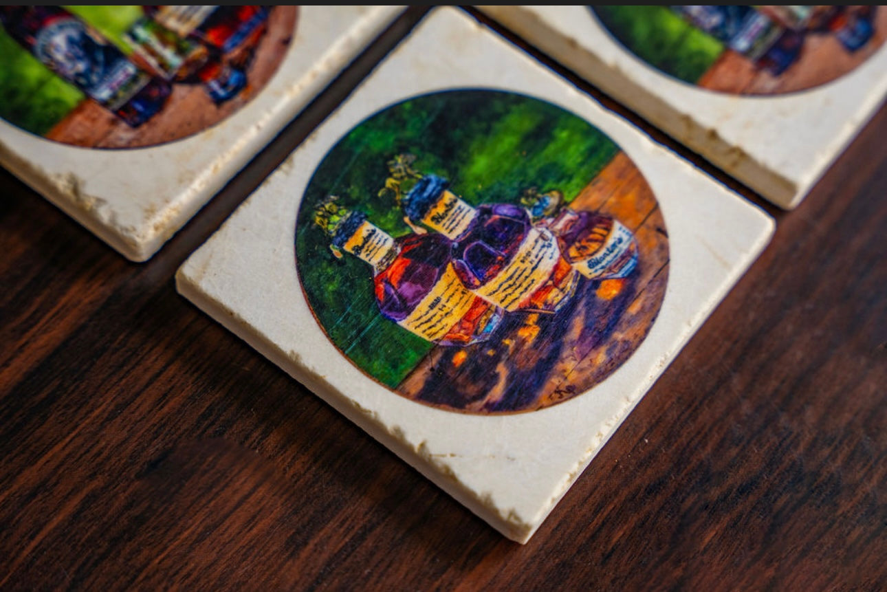 Handcrafted coasters from authentic tumbled marble, Kim Perry's design from her original paintings of Blantons and Pappy Van Winkle bring timeless artistry and function to the table. Each coaster is made in the USA using natural stone, giving it a unique character with subtle variations in texture and color. Designs are hand-printed to create rich, lasting images that won’t fade or peel, while the natural absorbency of the marble helps protect surfaces from condensation. Backed with cork to prevent scratches, these coasters combine durability, elegance, and everyday practicality—perfect for gifting or for adding a touch of classic style to any home or that special bourbon bar.
