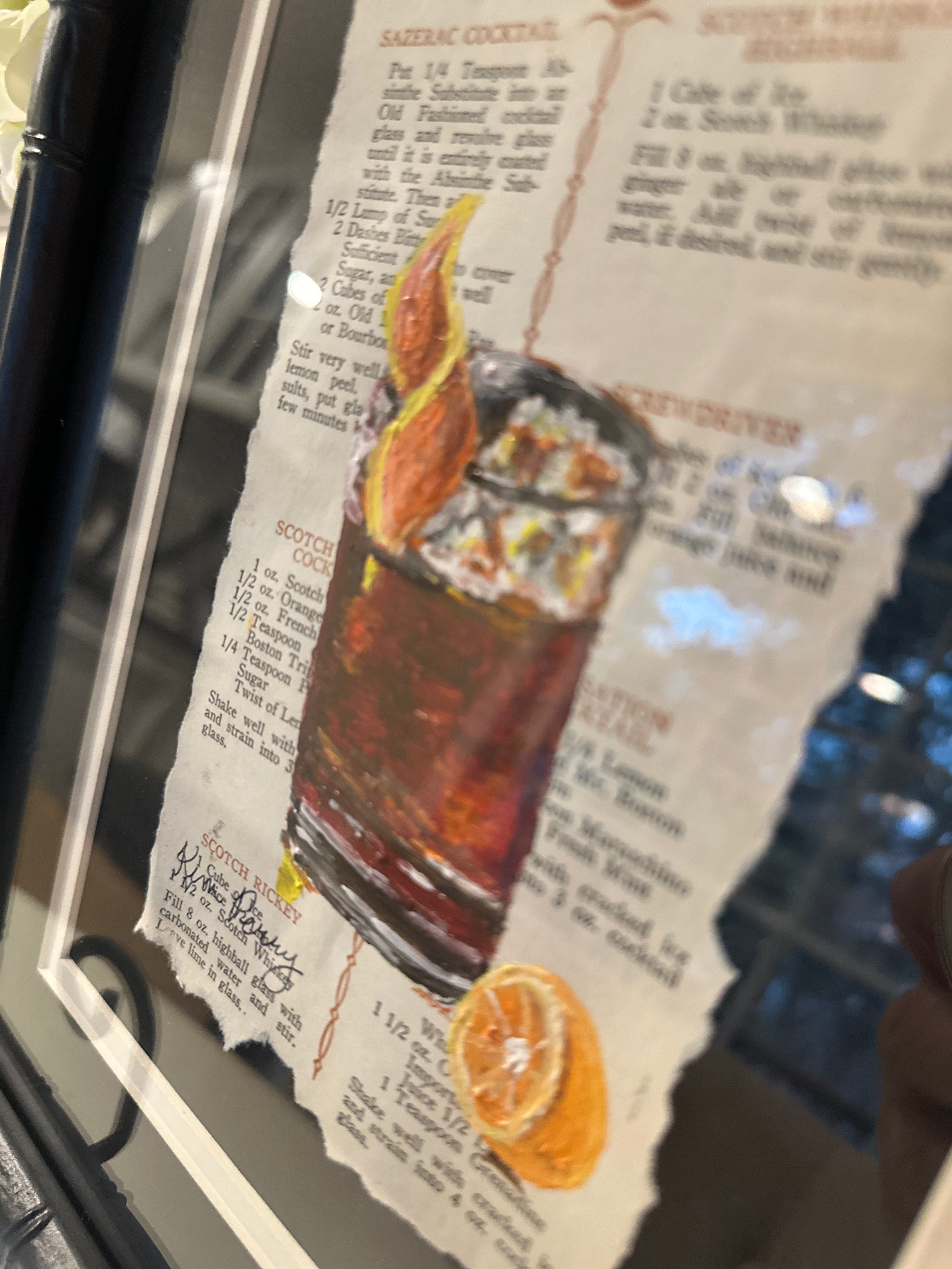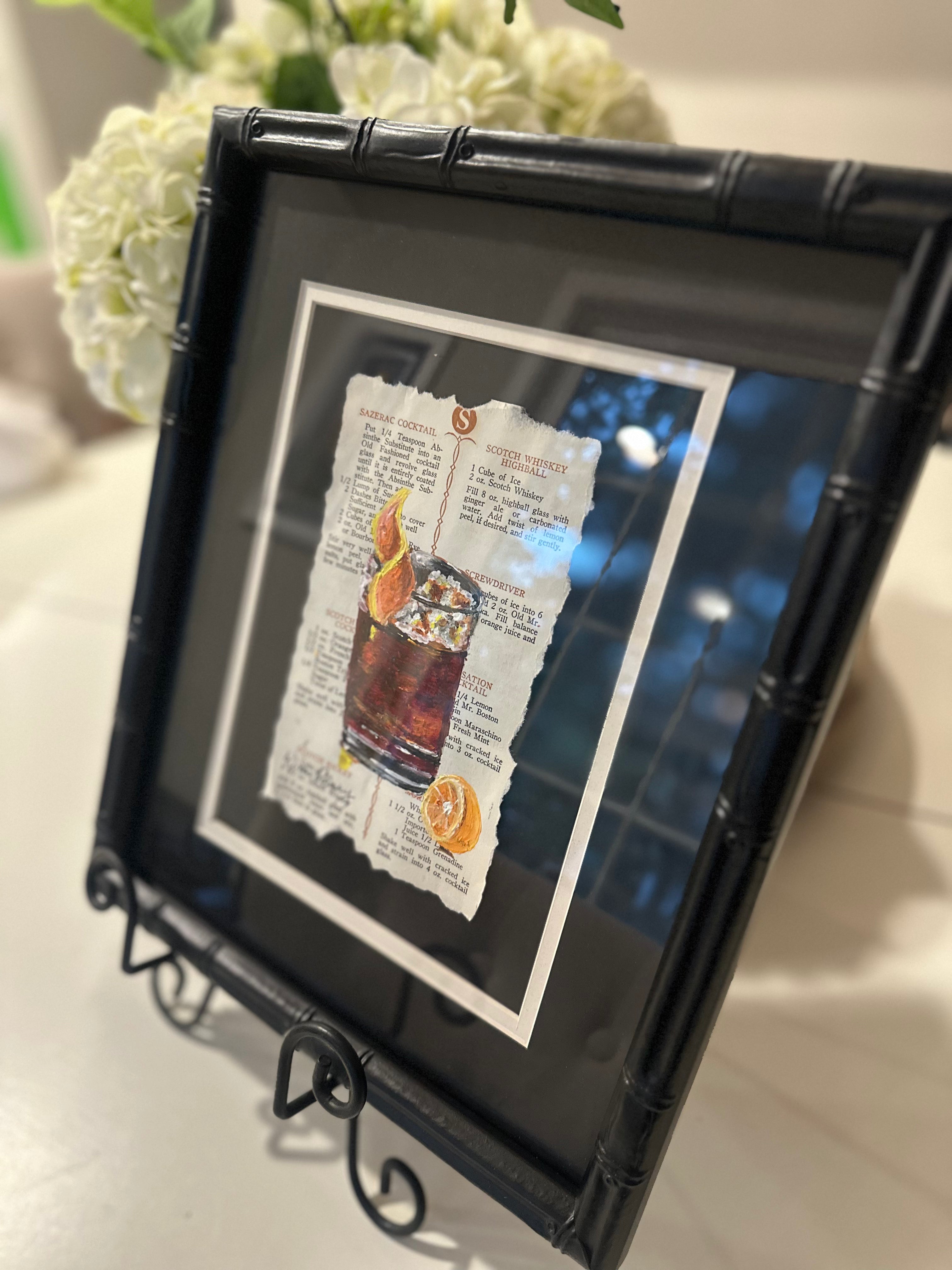 "A Proper Pour" is an original painting by Kim Perry. Inspired by a cocktail recipe found in a vintage book, celebrating tradition, storytelling, and the timeless ritual of crafting a well-made drink.This original painting draws inspiration from a cocktail recipe preserved in the pages of a book, blending literary charm with classic mixology. Rich textures and thoughtful details evoke the elegance of time-honored recipes and the artistry behind a perfectly crafted drink. A piece for collectors who appreciate tradition, storytelling, and the romance of the written word.