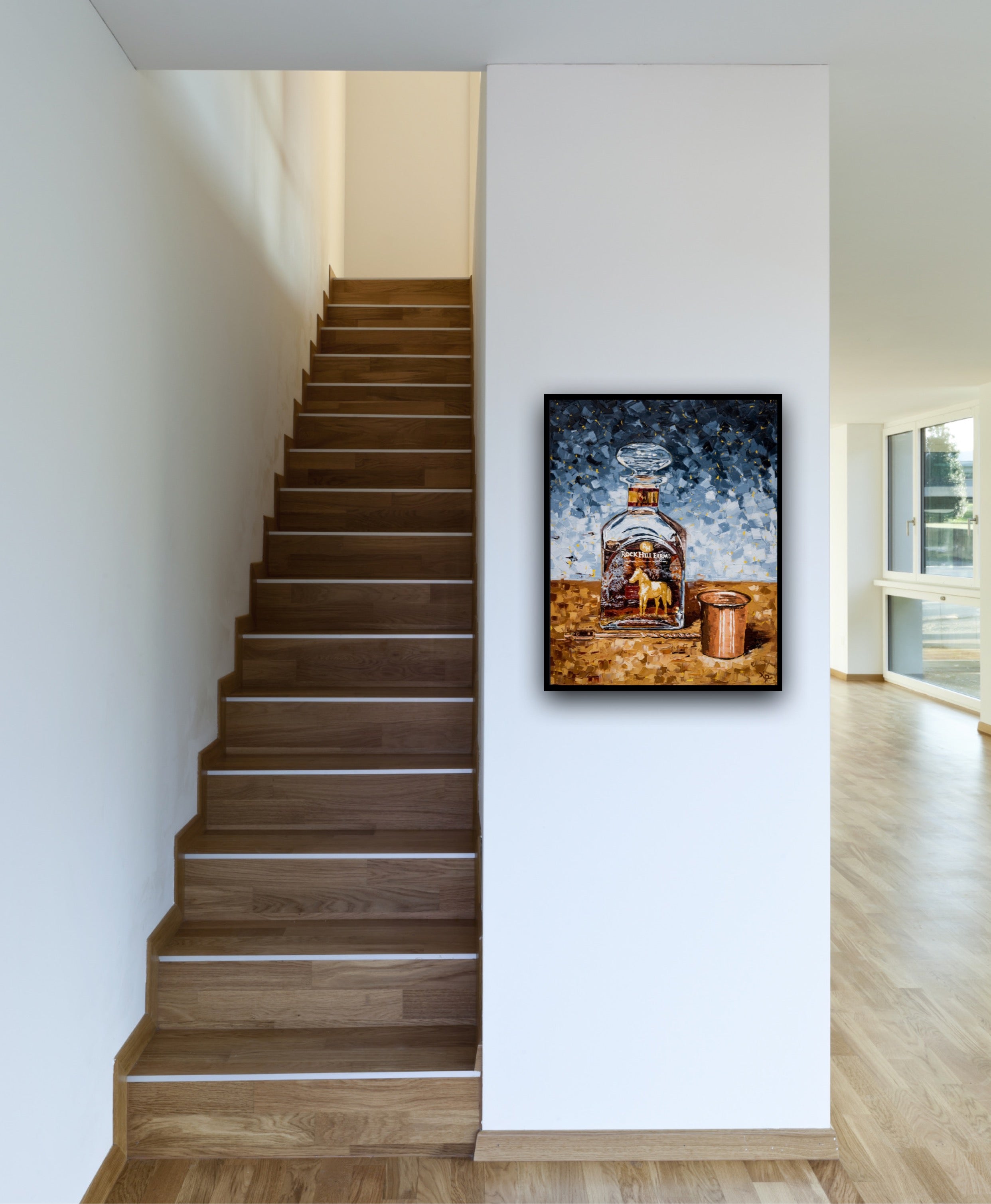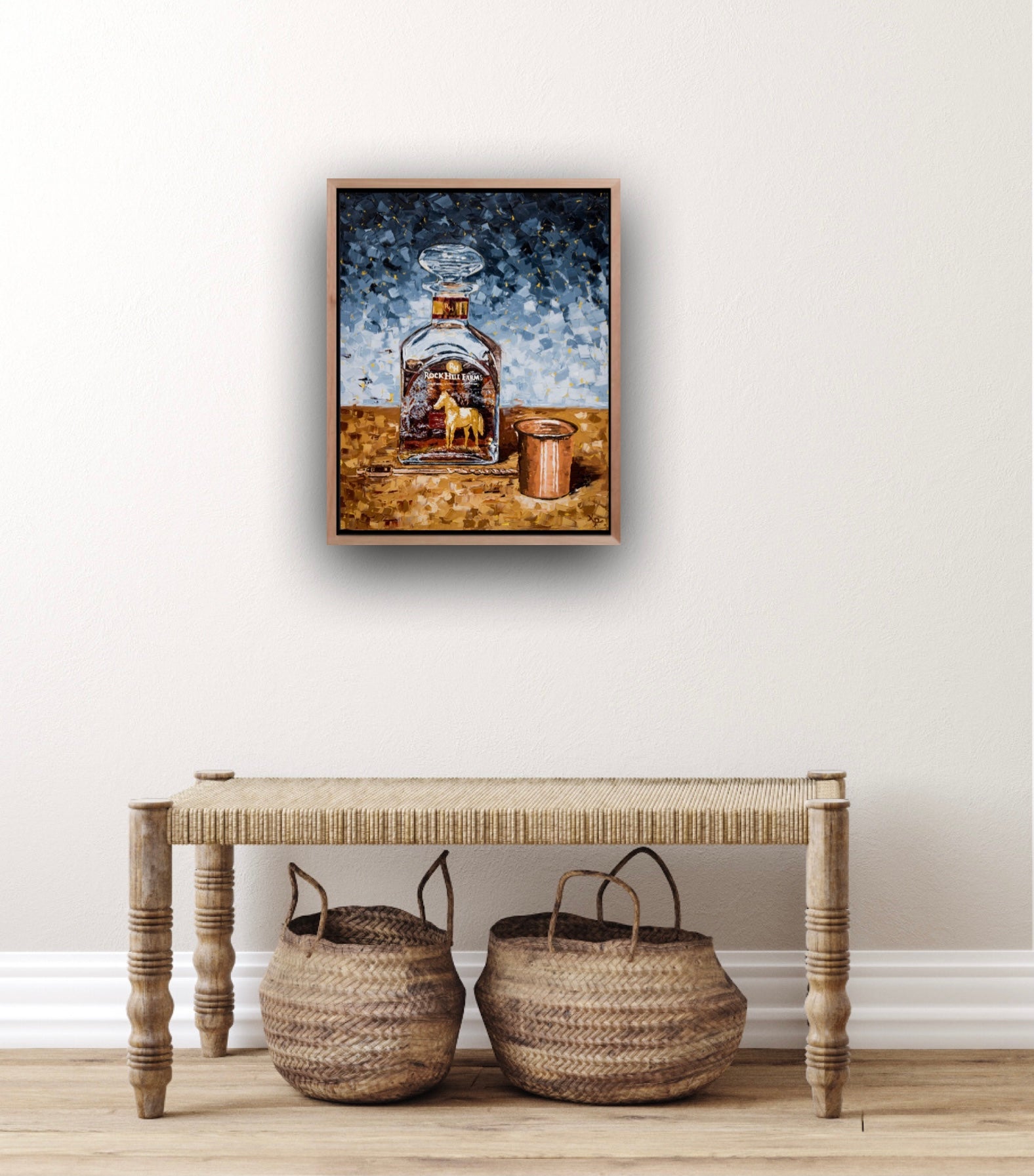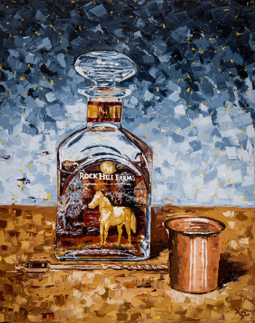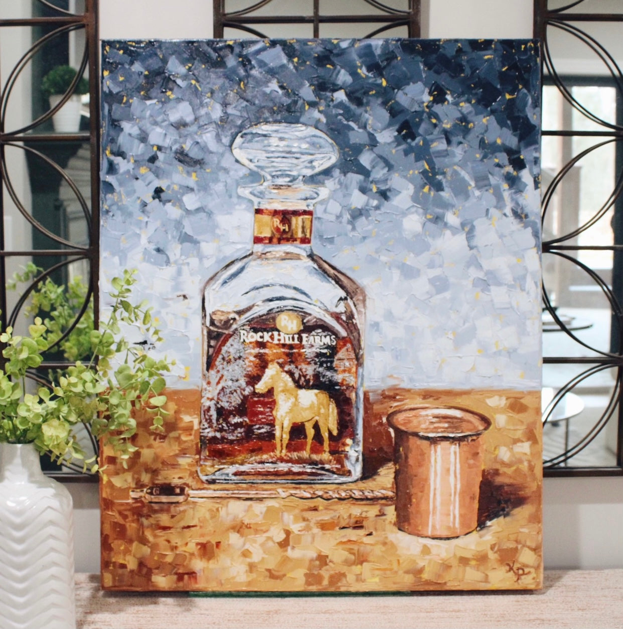 Created and inspired from the recent "Better with Bourbon" collection. 95% of the world's bourbon is produced right in the heart of Kentucky. Kim captures the artistry, the craftsmanship, and the legacy of each bottle by the unique palette knife technique using bold, intense colors.