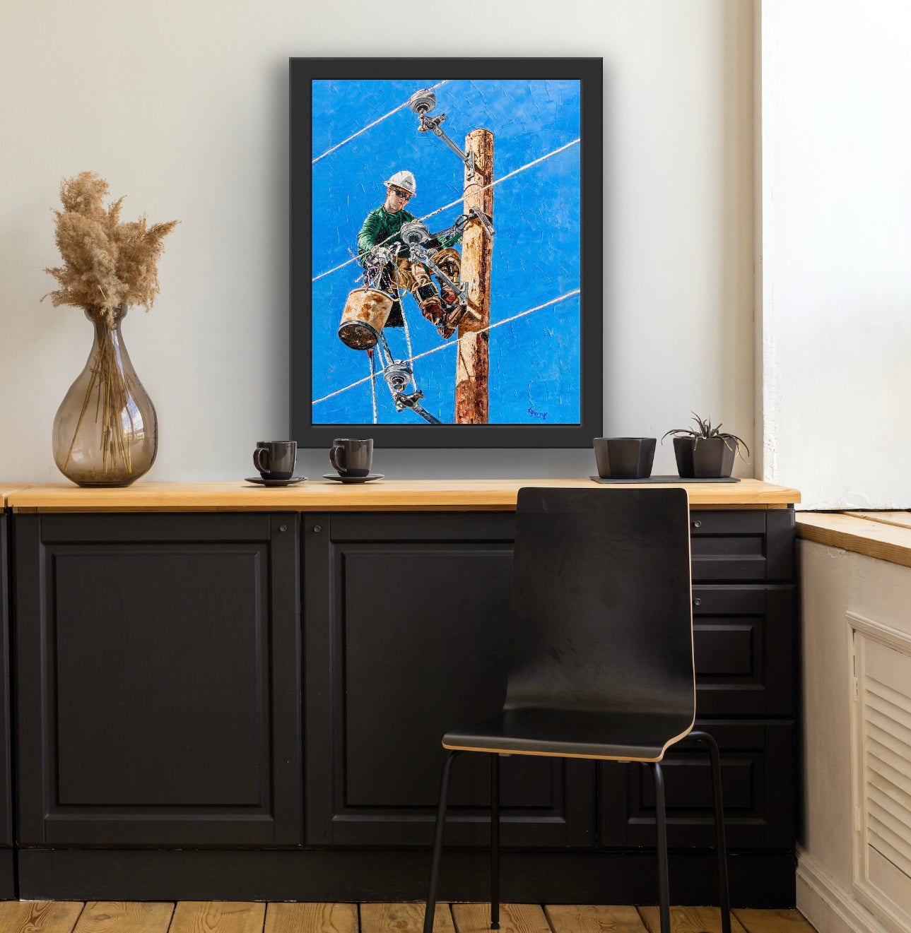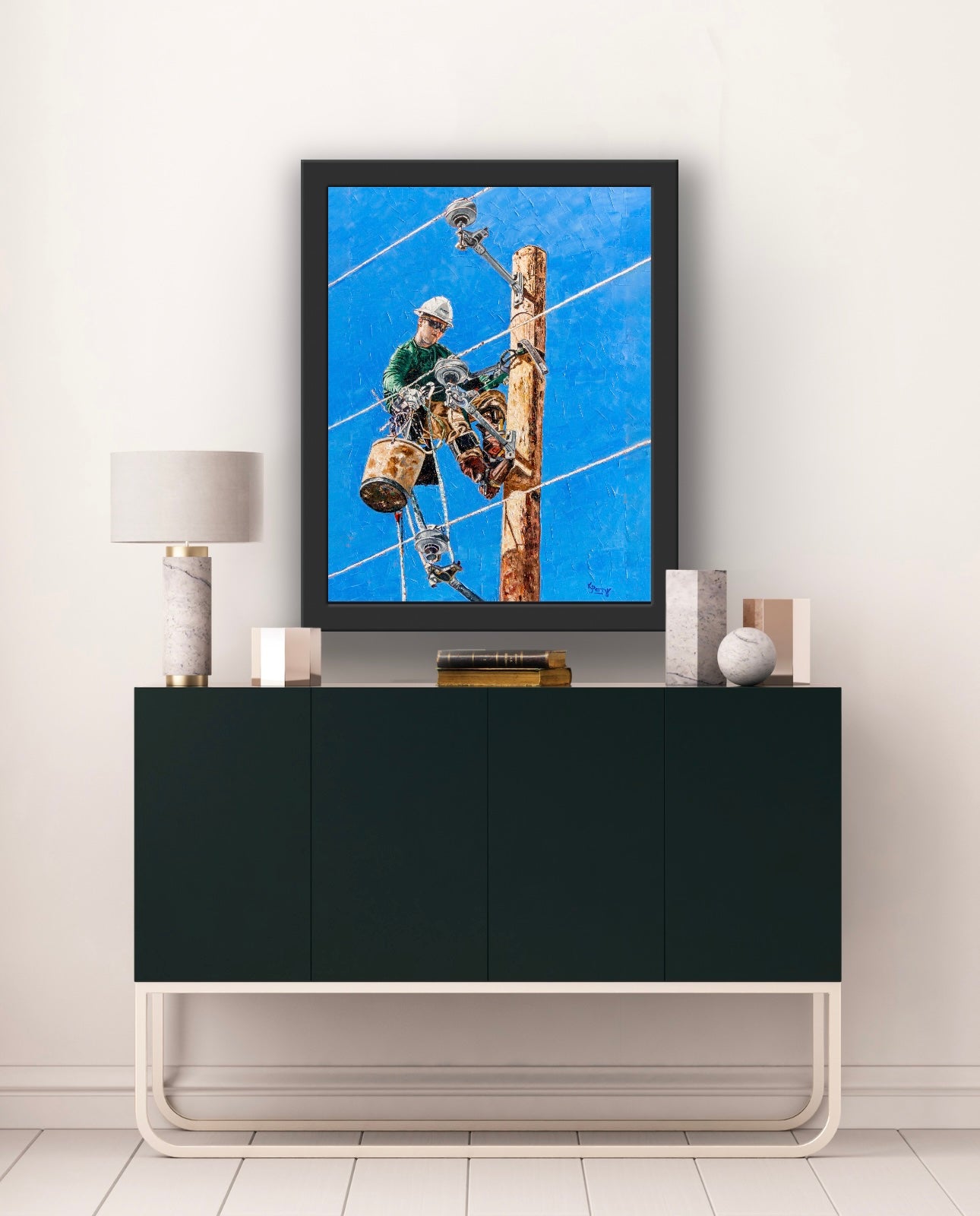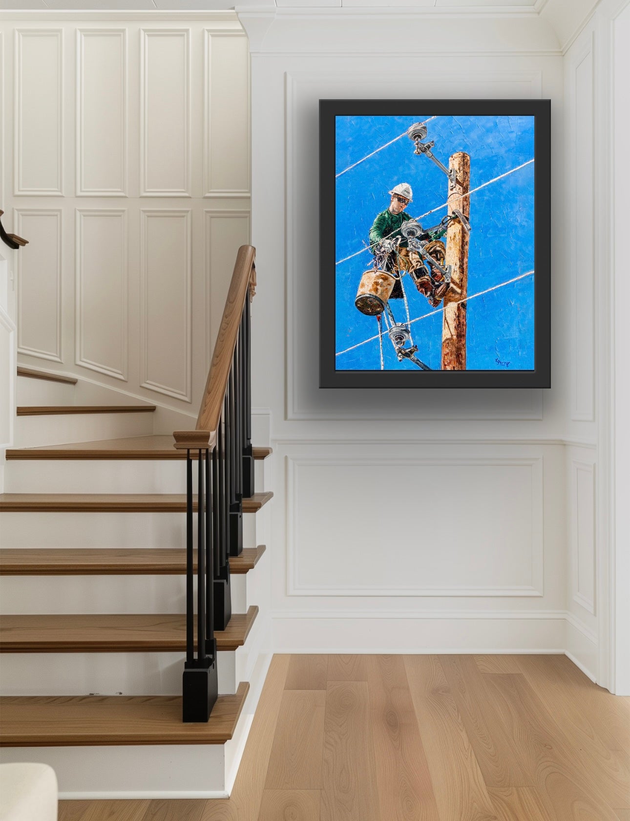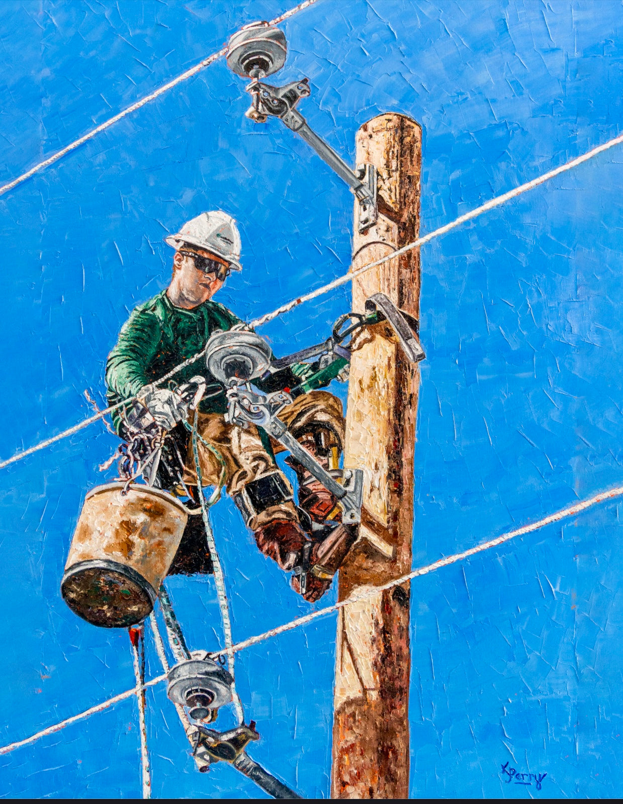 When the storm rolls in and the lights go out, that’s when the real heroes go to work. “High Voltage Hero”, painted by Kim Perry, pays tribute to the men and women who climb into the wind, rain, and darkness to bring the world back to light.