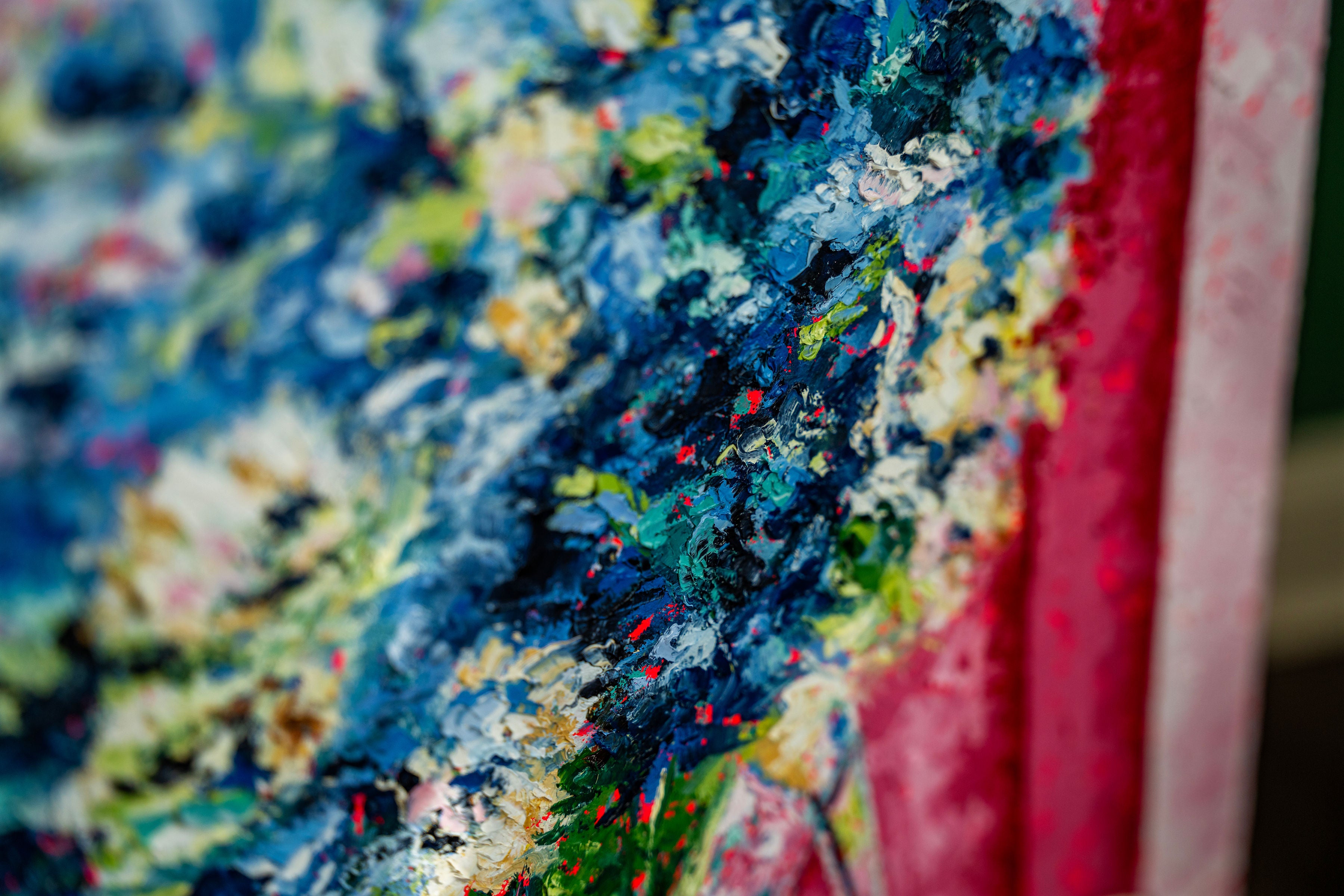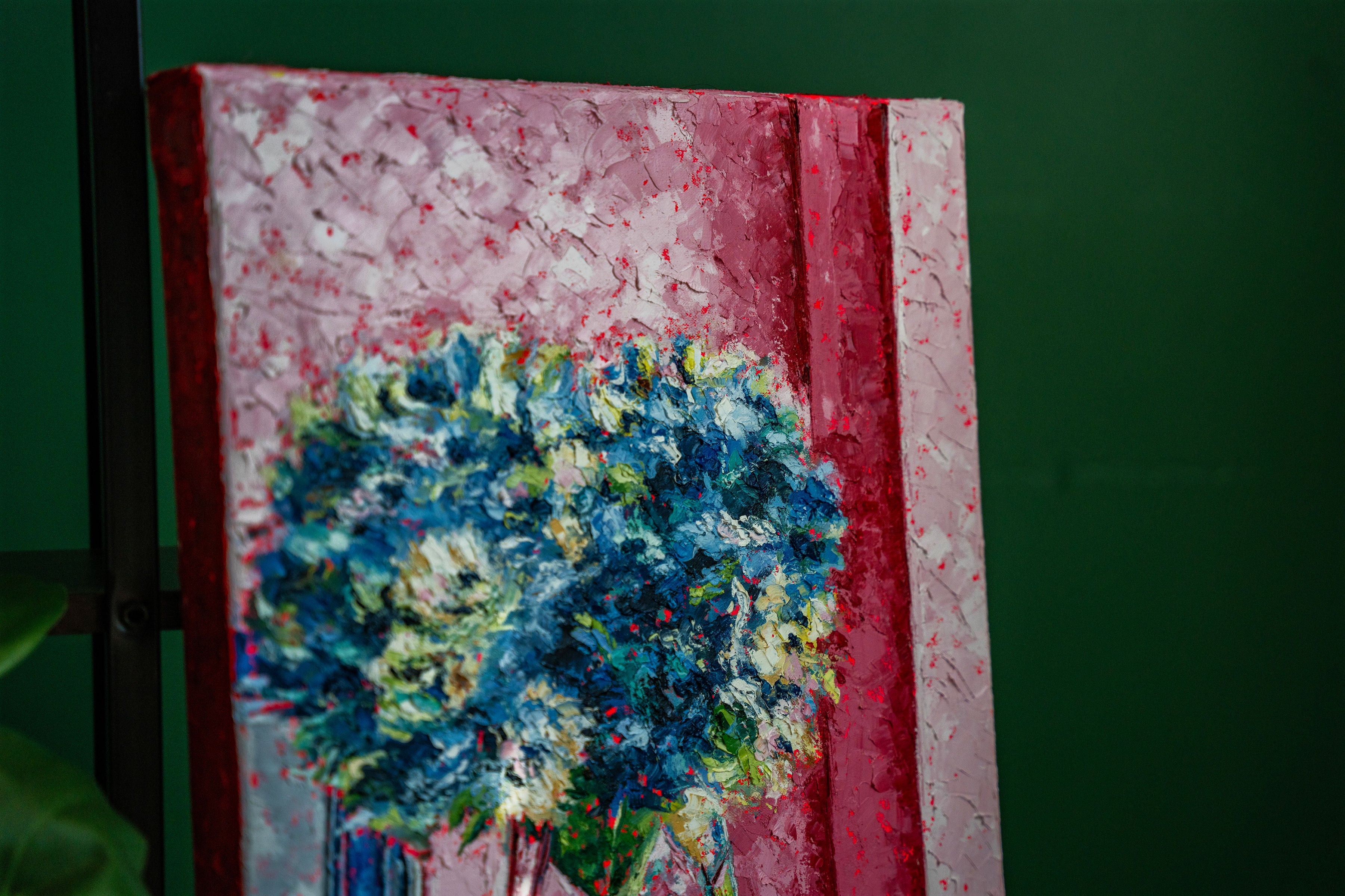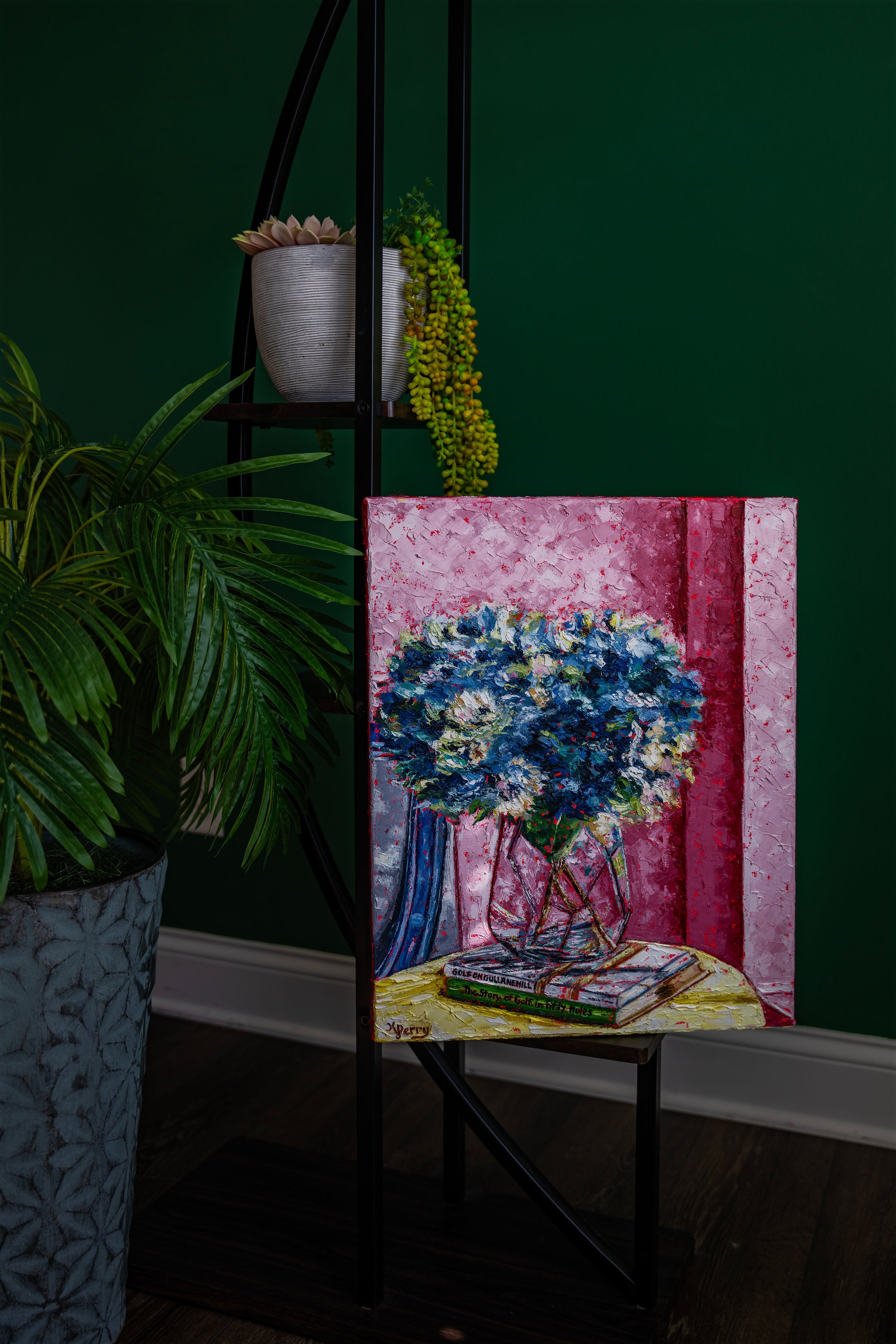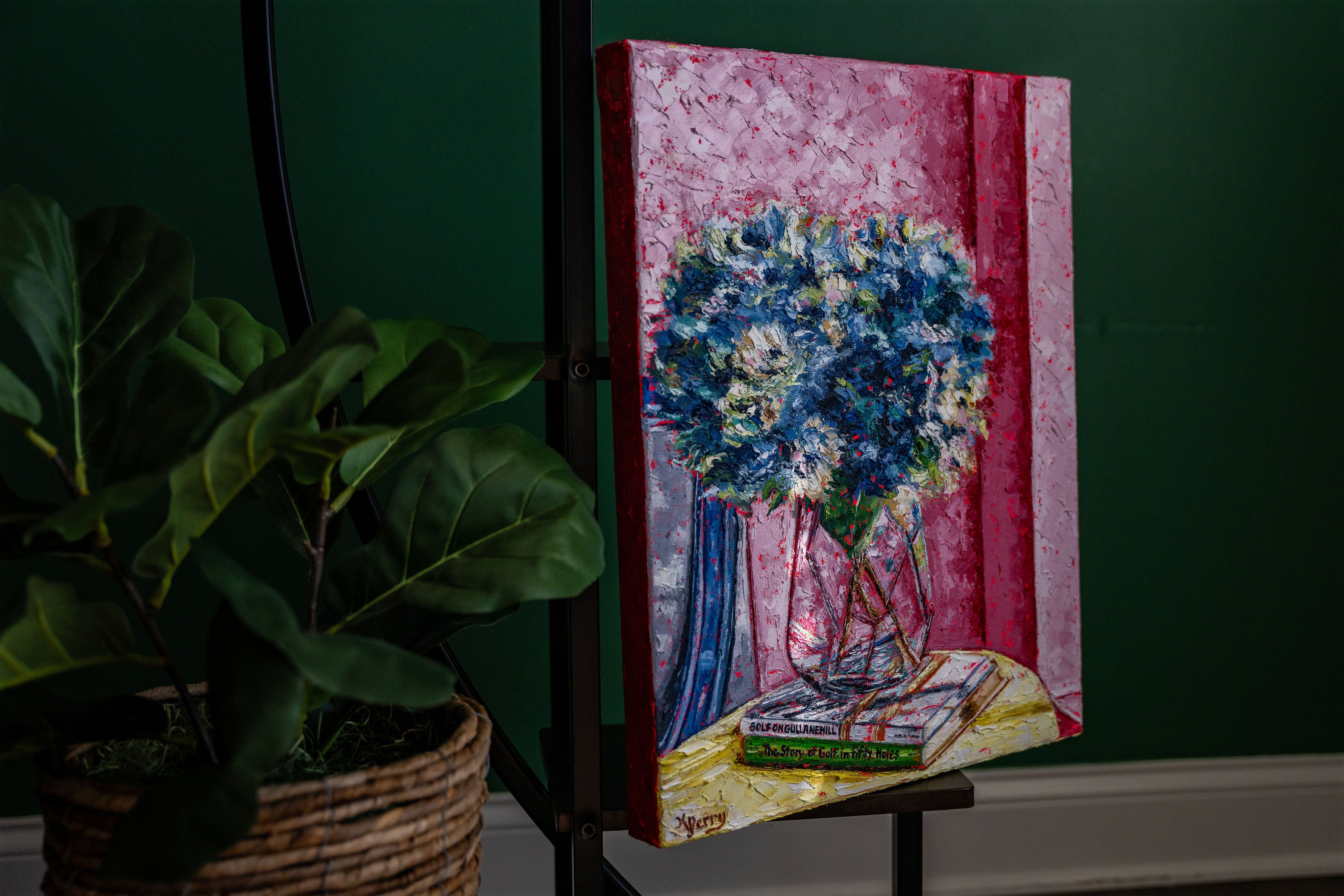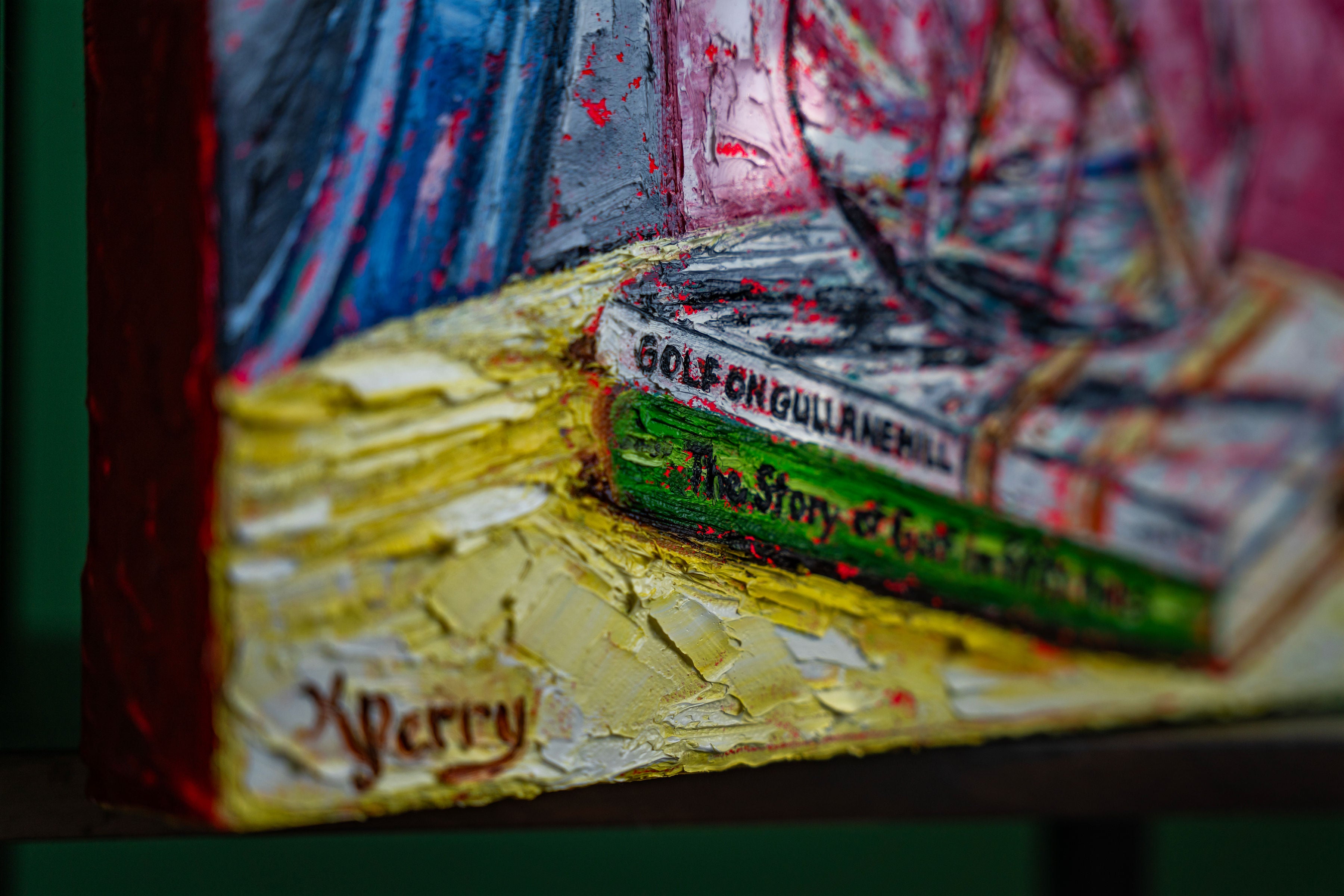 Kim enjoys the calmness of the morning taking a moment to breathe in the essence of what the golf game represents. She employs the lush texture and depth that oil paints offer to capture the play of light on the hydrangeas and the tactile quality of the books. The overall atmosphere is likely one of quiet sophistication, where one can find peace in the harmonious blend of natural beauty and intellectual pursuits.